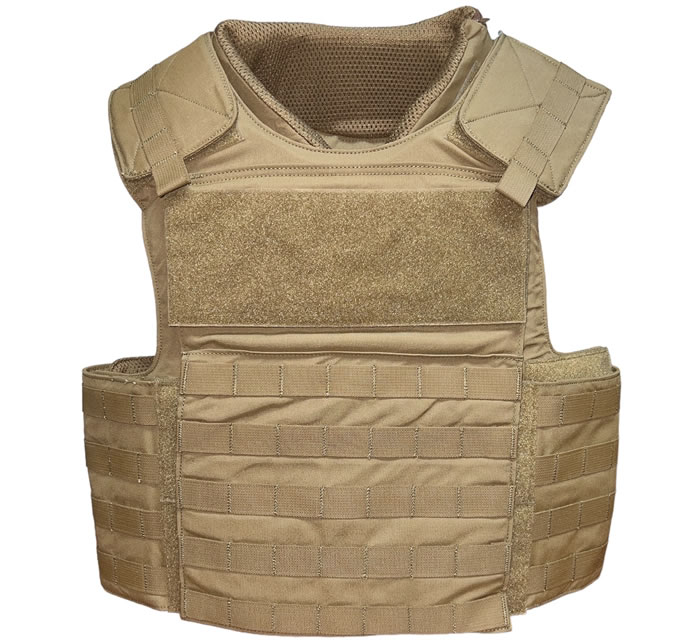 La funda táctica esta elaborada con tela de nylon de alta resistencia, bolsas para insertos balísticos en parte frontal y trasera y sistema MOLLE en parte frontal trasera y lateral. Cuenta con ajustes en hombros y laterales.