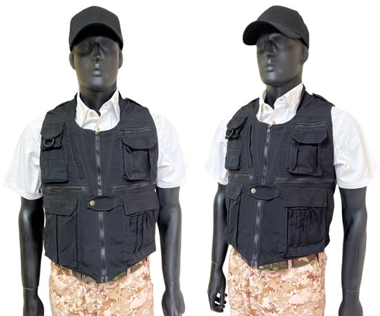 Chaleco antibala tipo safari con paneles balísticos de polietileno de alta densidad o de aramida unidireccional encapsulados en un forro 100% impermeable sellados por equipo de ultrasonido.